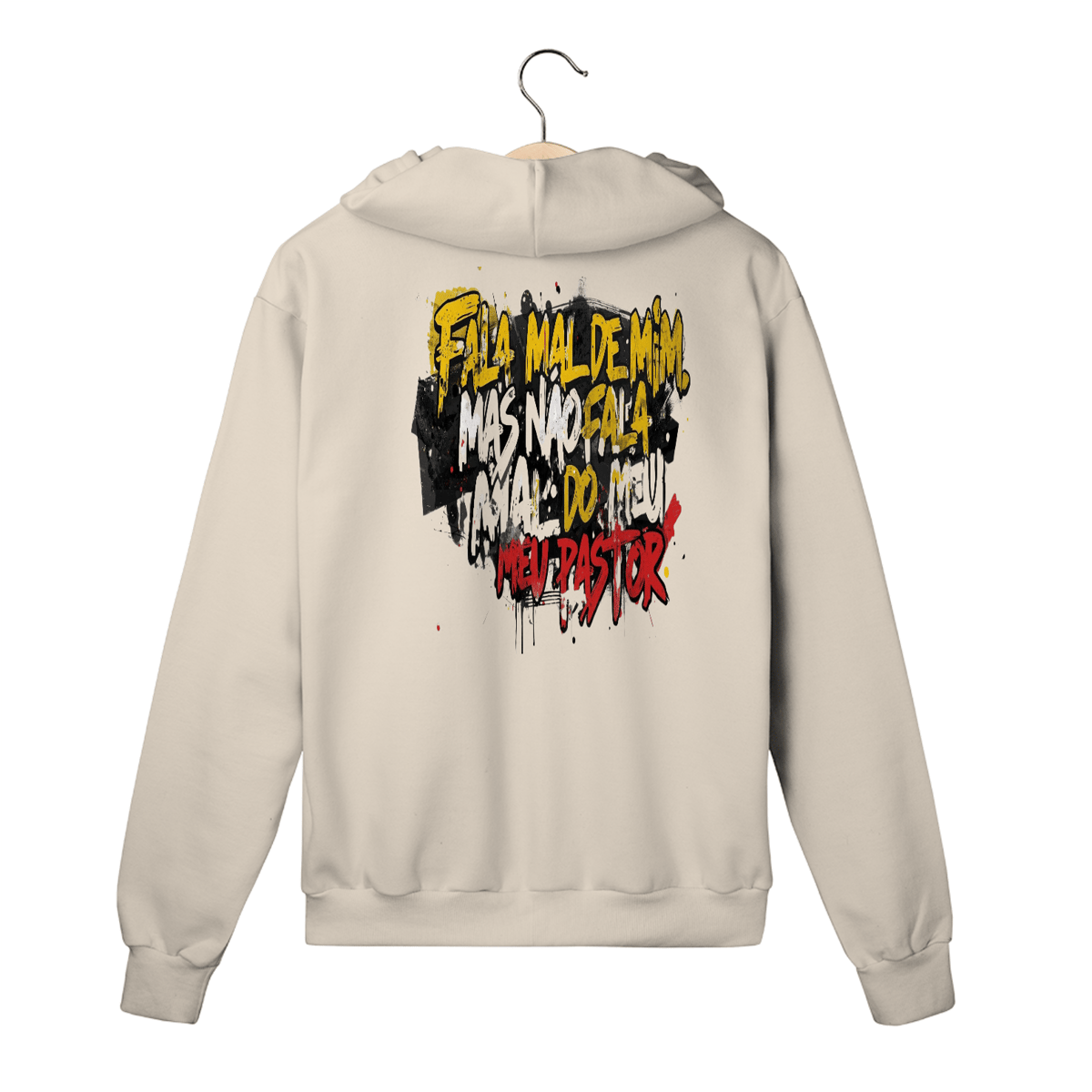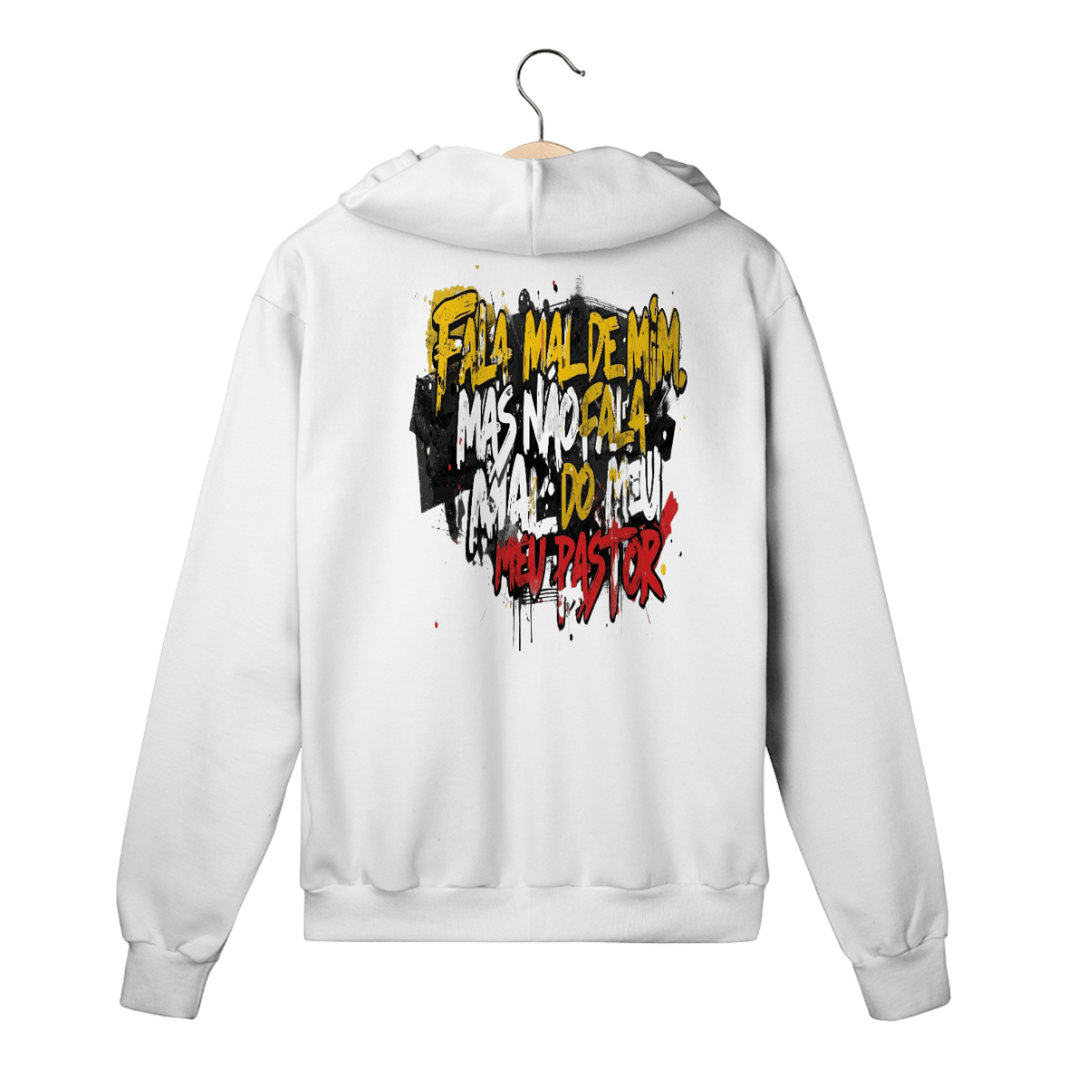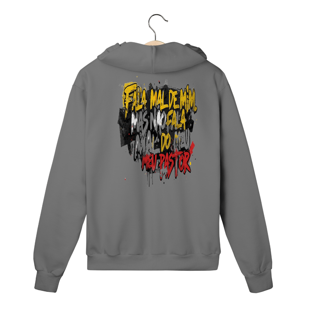 O moletom “Fala mal de mim, mas não fala mal do meu pastor” carrega a força da identidade cristã com um toque urbano.