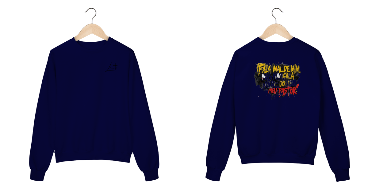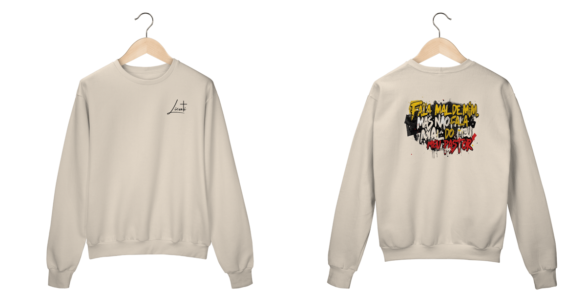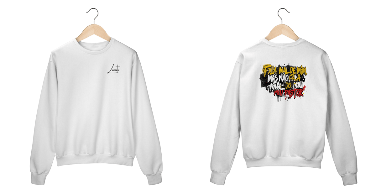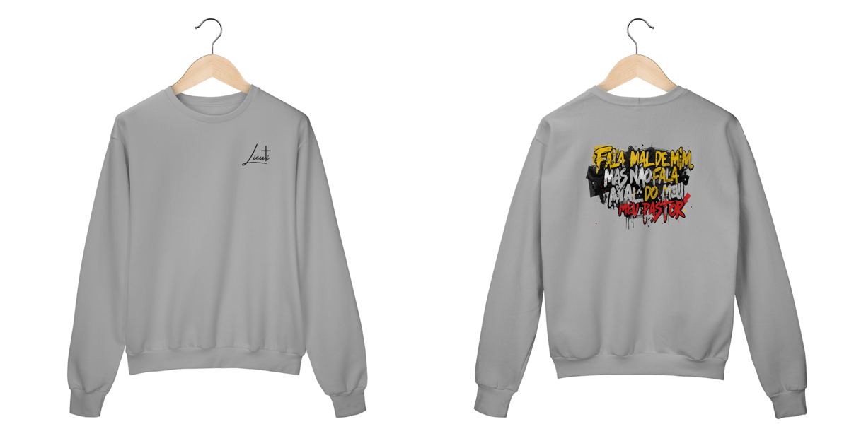 O moletom “Fala mal de mim, mas não fala mal do meu pastor” carrega a força da identidade cristã com um toque urbano.